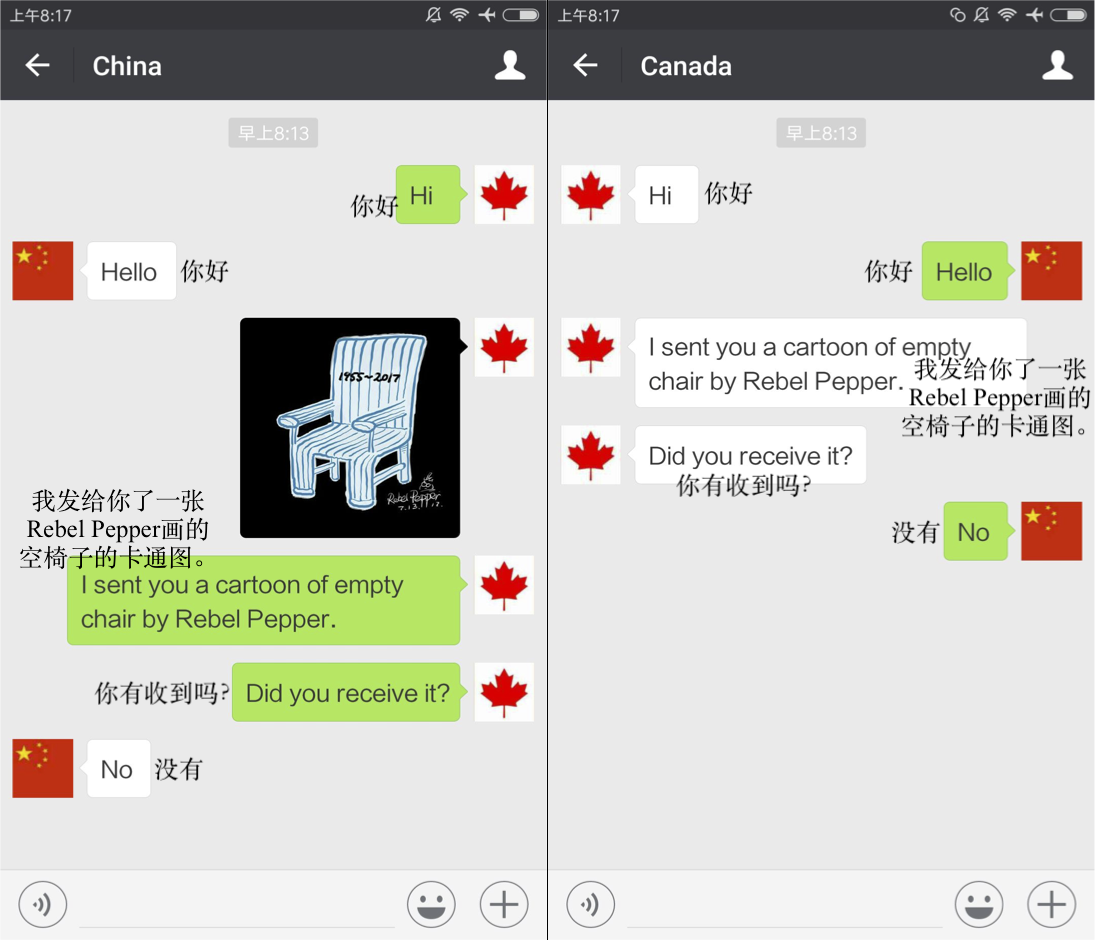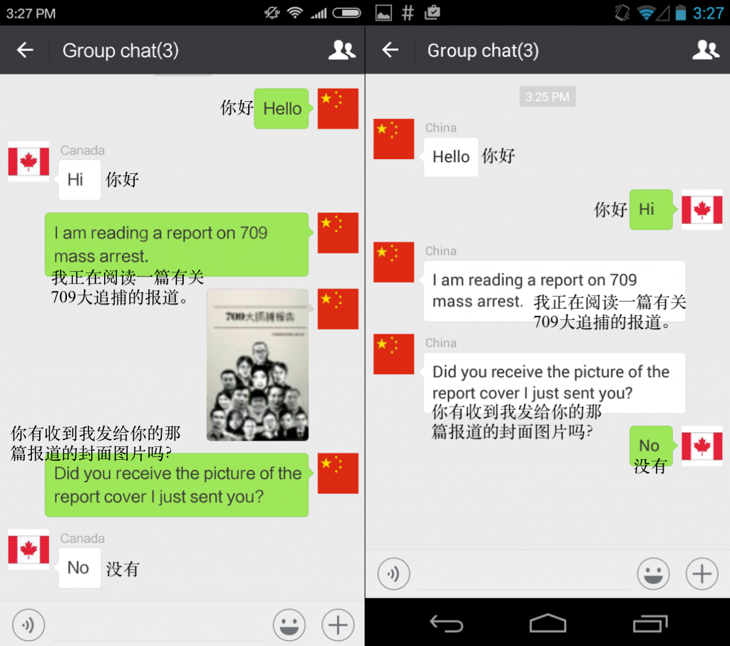 虽然关键字、关键词组合、图片、网址(URLs)在中国大陆的所有平台上均受到审查,但我们项目的重点研究对象是公民实验室收集整理的有关微信平台上的审查数据。公民实验室在微信平台上对一些已知的审查主题进行了测试。实验团队使用一个加拿大手机号码注册的微信账号向另一个中国大陆手机号码注册的微信账号发送敏感消息。团队发现,中国大陆的微信账号并未收到加拿大微信账号发来的包含敏感主题的微信消息(见下图)。完整的测试报告请见这里。